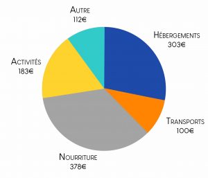 On voit sur ce graphisme que nos principaux points de dépenses sont les hébergements et la nourriture. Nous aurions pu baisser un petit peu ces dépenses puisqu’à Chiang Mai nous avons choisi de nous prendre un hôtel un peu plus confort puisque nous allions y passer une semaine et que pour la nourriture même si nous avons très souvent manger dans les boui-bouis où mangent les locaux ou sur les marchés (ou la nourriture est la moins cher), nous avons également craqué pour plusieurs restaurants occidentaux (italiens en particulier) parce que nous avons un coup de mou et nous voulions retrouver des saveurs de chez nous. Pour le reste, dans activités il y déjà 70 euros de cours de cuisine et dans autre, il y a également 7 euros de coiffeur pour Sam et 55 euros de colis pour la maison avec du thé. Donc sur ce budget on pourrait facilement supprimé une centaine d’euros (sans supprimé le cours de cuisine). On aurait alors dépensé 39 euros par jour pour deux soit presque le budget d’une seule personne comparé à la moyenne.