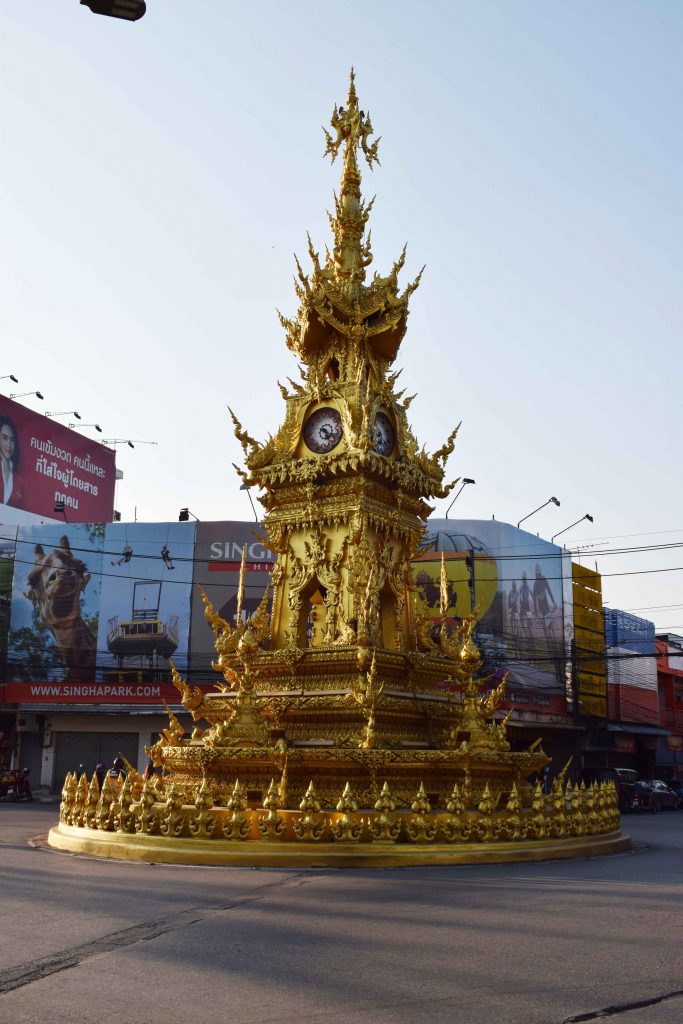 Cette horloge au milieu d’un rond point est en quelque sorte le symbole de Chiang Rai. Il s’agit à nouveau d’une oeuvre de l’artiste Chalermchai Kositpipat.