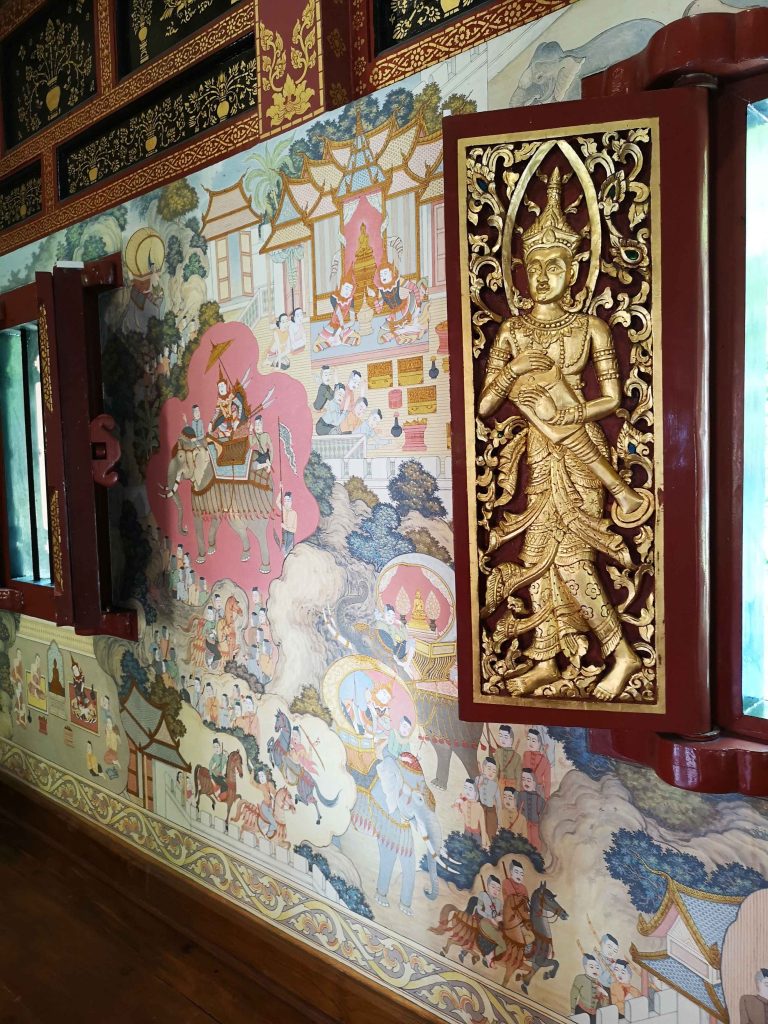Ce petit temple est juste magnifique, il vaut selon nous le détour si vous passer par le temple du bouddha d’émeraude. Dessinées par Thawan Dutchani, les décoration de la chapelle raconte l’histoire des quatre éléments (eau, feu, terre, air).
