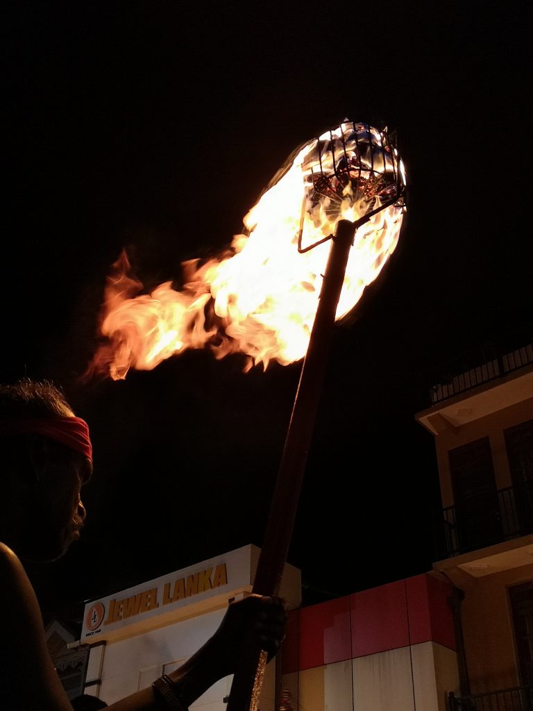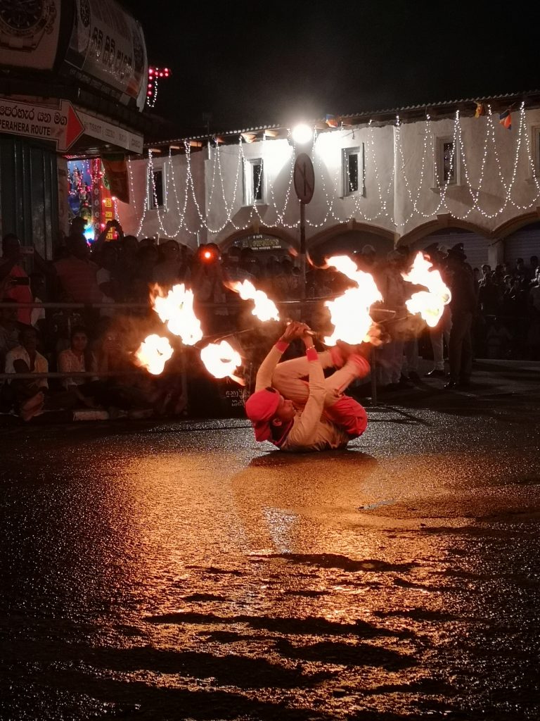 En parlant de processions bouddhiques, connaissez-vous l’Esala Perahera ? C’est une fête religieuse que l’on trouve uniquement ici, à Kandy au mois de Juillet – Août, il faut vous renseigner sur les dates, car elles changent chaque années. Cela tombait bien pour nous, car nous sommes arrivés à Kandy durant ce festival. Ce festival consiste en quoi ? Chaque soir à 20h la ville s’arrête de vivre pour se retrouver le long des routes du centre ville, là où une parade est prévue et déambule dans la ville. Nous avions repéré un peu le tracé de la parade dans l’après midi, car tous les jours le chemin est différent.