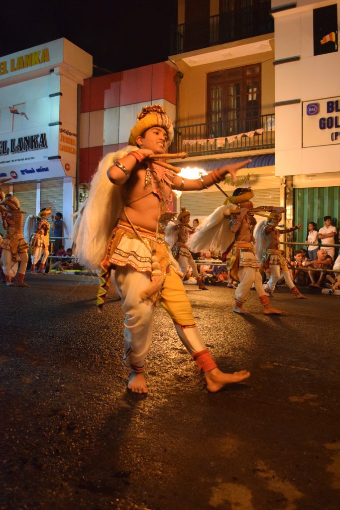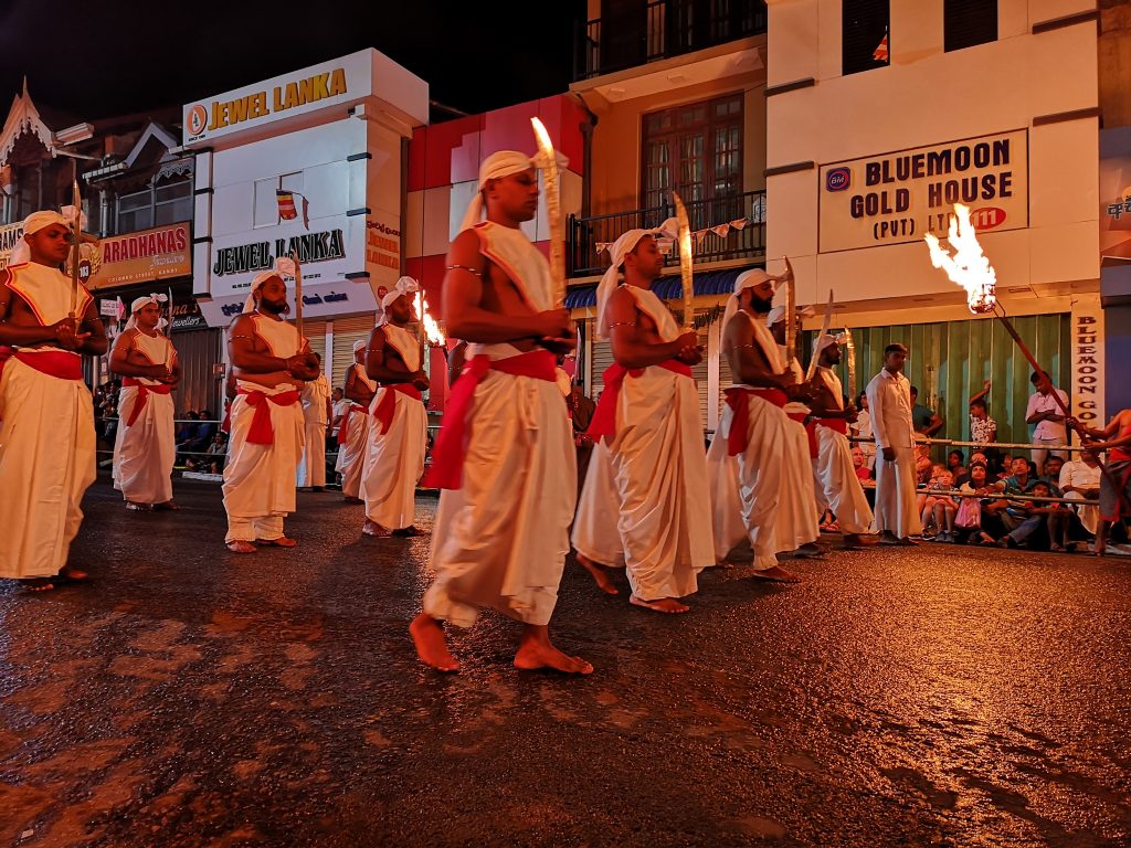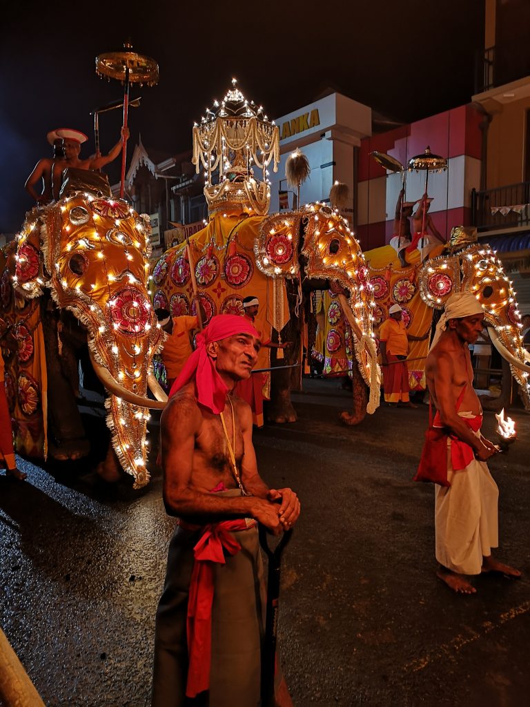 Ce défilé est composé de danseurs et musiciens, tous habillés en tenue locale. Mais le symbole phare de cette fête est l’éléphant. En effet durant cette procession religieuse, une plus d’une vingtaine d’éléphants déambulent en même temps que la parade.