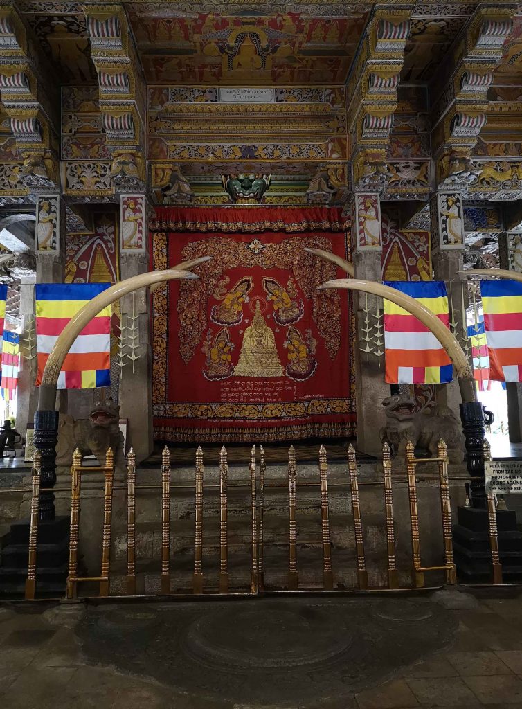 Le bâtiment principal est une construction en bois sur 2 étages comprenant une cours intérieure avec un bâtiment et son autel où se situe la dent du Bouddha, symbole du pays car quiconque l’avait en sa possession, contrôlait le pays entier. Ou plutôt sa réplique, mais que l’on ne voit pas non plus car elle est cachée au centre de l’autel dans un reliquaire en or en forme de dagoba. La vrai dent étant détenue dans un endroit très sécurisé. L’enceinte du palais comprend plusieurs bâtiments et il est bon s’y promener. Vous pourrez donc accéder à la salle d’audience, un bâtiment en bois ouvert sur l’extérieur, connu pour ses piliers sculptés, plusieurs temples, musées ou encore la salle de l’éléphant Rajah contenant la dépouille naturalisée de l’éléphant le plus célèbre du Sri Lanka, au service des processions bouddhiques pendant plus de 50 ans.