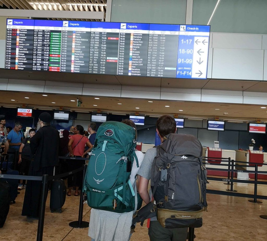 Dimanche 7 juillet, nous arrivons donc à l’aéroport de Genève avec un total de 24,8 kg pour nos gros sacs, plus 1 petit sac chacun de 4 kg… Ce n’était pas vraiment ce que nous avions prévu mais impossible pour nous de faire l’impasse sur un quelconque objet… (je vous rassure après 5 jours de voyages on avait déjà une petite liste d’objets à renvoyer en France). Après un dernier verre de Coca bien frais avec notre famille, nous embarquons dans l’avion qui nous mène à Istanbul. Premier repas en vol pour moi, et dernière bouteille de vin, français (25cl je vous rassure) pour cette prochaine année.