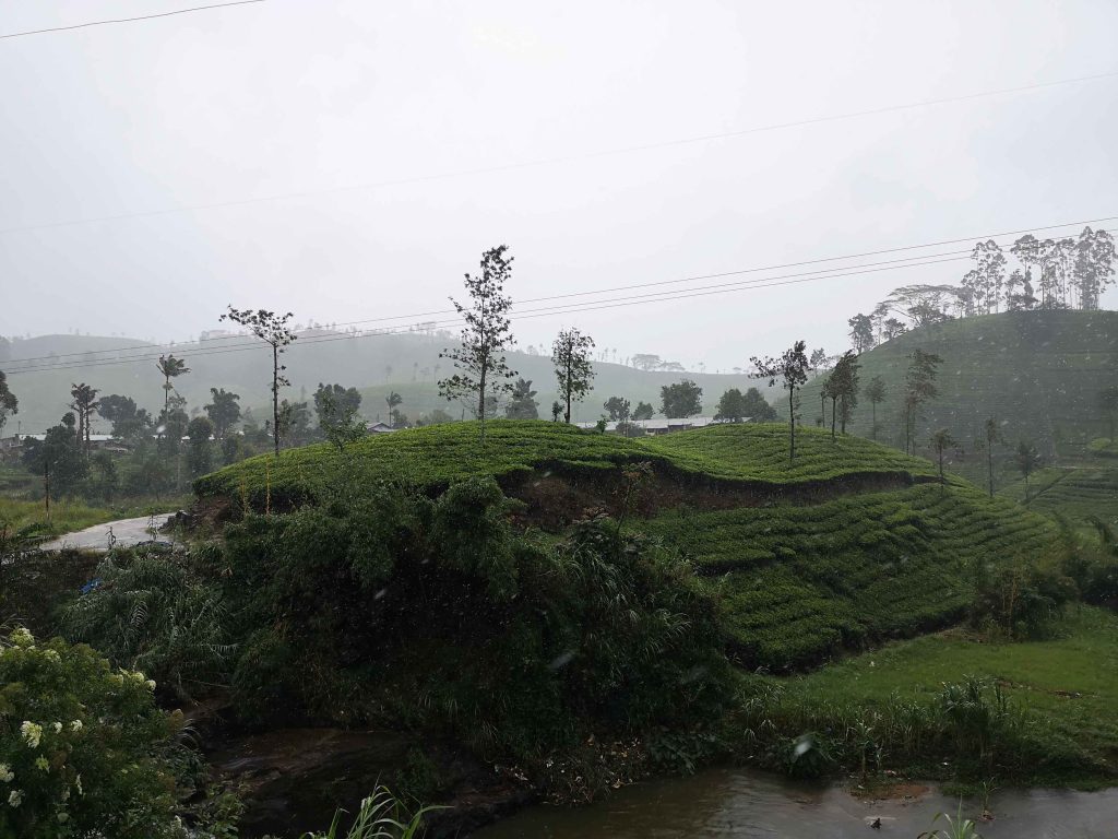 Allez on reprend la route direction la cascade. On vous a deja dit que c’était la mousson ? Bah voilà… Le soleil c’est très court… On a donc marché une bonne heure sous une brume légère avec quelques averses un peu plus fortes de temps en temps. Nous étions équipés, rien de grave. Jusqu’au moment où on s’est pris une très grosse averse ! On a eu juste le temps de s’abriter dans un abri de bus… On a attendu 1h ici avec des locaux qui attendaient le bus. Nous avons choisi de laisser tomber la cascade, n’étant qu’à 900m de la tea factury. En général, en Asie, les averses durant la mousson ne sont pas très longues. Mais au moment où on s’est dit go on met nos ponchos par dessus nos sacs et nos imperméable et on y va. Eh bah la pluie a redoublé encore ! On aurait pas cru que c’était possible vu comme il pleuvait ! Résultat… On a attendu le bus… Oui pour 900m…