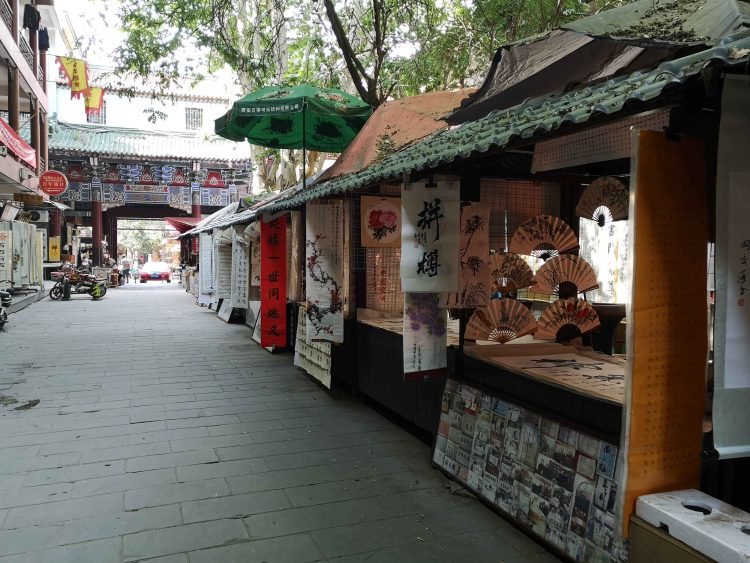 Durant le reste de l’après midi nous sommes descendu plus au sud de la ville jusqu’à la muraille qui entoure le centre ville de Xi’an et nous avons flâné dans les ruelles moins touristiques à la recherche de quartiers typiques et de la vie plus proche des locaux. Nous sommes d’ailleurs tombés sur un petit marché de peinture à l’encre de chine sur tissus et sur éventails…